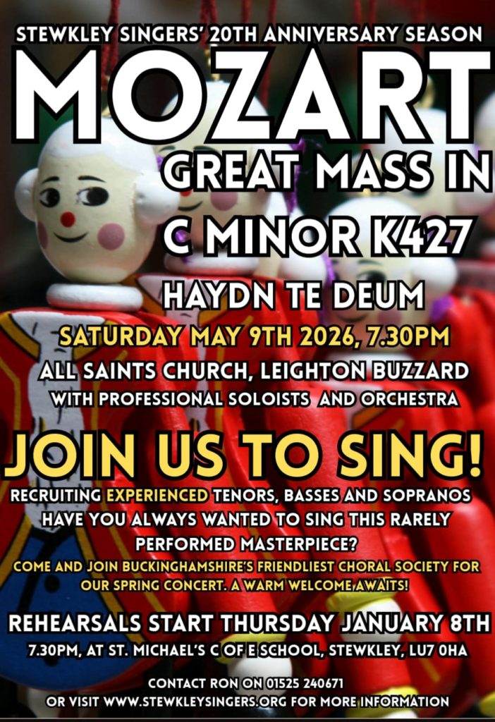 Please call our secretary, Ron Sims, on 01525 240671 or contact us by the “Join Us” page here: https://www.stewkleysingers.org/?page_id=34
