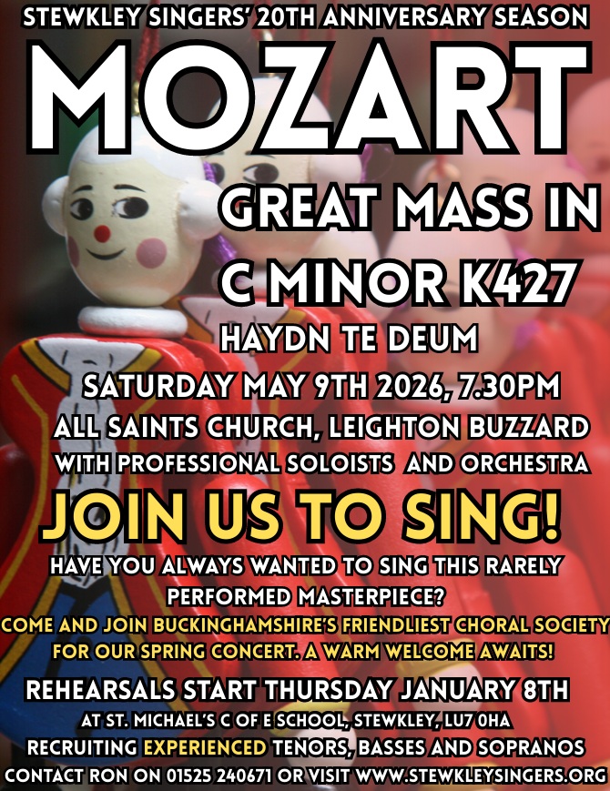 The Stewkley Singers was founded in September 2006 and now comprises a friendly choir of approximately 50 singers aged between 15 and 88 (young people from Year 7 upwards are welcome). We meet in the main hall at St Michael’s School, Stewkley on Thursday evenings throughout the Autumn and Spring terms. New members are welcome; please call our Secretary, Ron Sims, on 01525 240671.